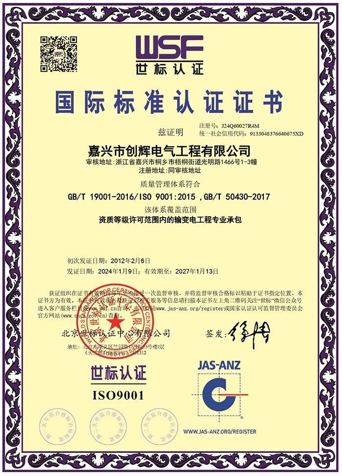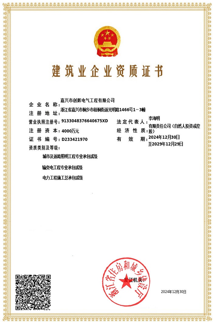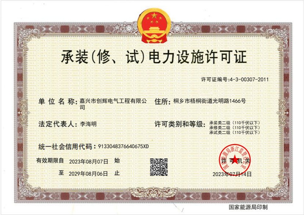 嘉興市創(chuàng)輝電氣工程有限公司,總部坐落于浙江桐鄉(xiāng)經(jīng)濟(jì)開發(fā)區(qū),公司成立于2004年,是一家承接高、低壓輸變電工程施工安裝、維修的企業(yè)。公司下設(shè)人事行政部、預(yù)結(jié)算部、采購(gòu)部、財(cái)務(wù)部、營(yíng)銷部和工程部等,其中工程部根據(jù)具體作業(yè)內(nèi)容分設(shè):變電項(xiàng)目部(12個(gè)班組)、線路項(xiàng)目部(6個(gè)班組)。現(xiàn)有員工500余人,其中擁有一級(jí)建造師3名,二級(jí)建造師15名,高級(jí)工程師1名,工程師36名,助理工程師52名,高壓電工240余名。目前我公司已具備電力工程總承包貳級(jí)資質(zhì),輸變電工程專業(yè)承包貳級(jí)資質(zhì),城市及道路照明工程專業(yè)承包貳級(jí)資質(zhì),承裝(修、試)電力設(shè)施許可二級(jí)資質(zhì),建筑施工安全生產(chǎn)許可,是浙江省高新技術(shù)企業(yè)、省AAA級(jí)“守合同重信用”企業(yè)。